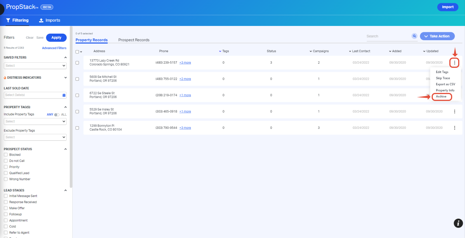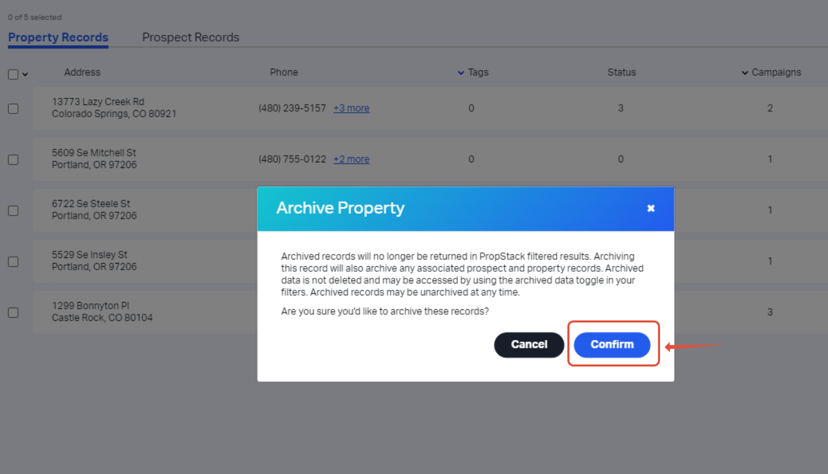 - Unarchive: Your Prospect and Property Records will be displayed within the "active" pages of your PropStack™ database.